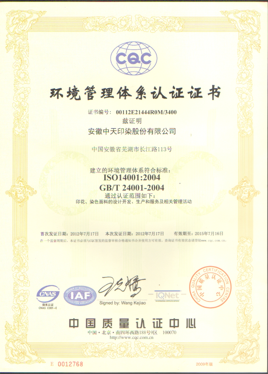 2012年榮獲環境管理體系認證